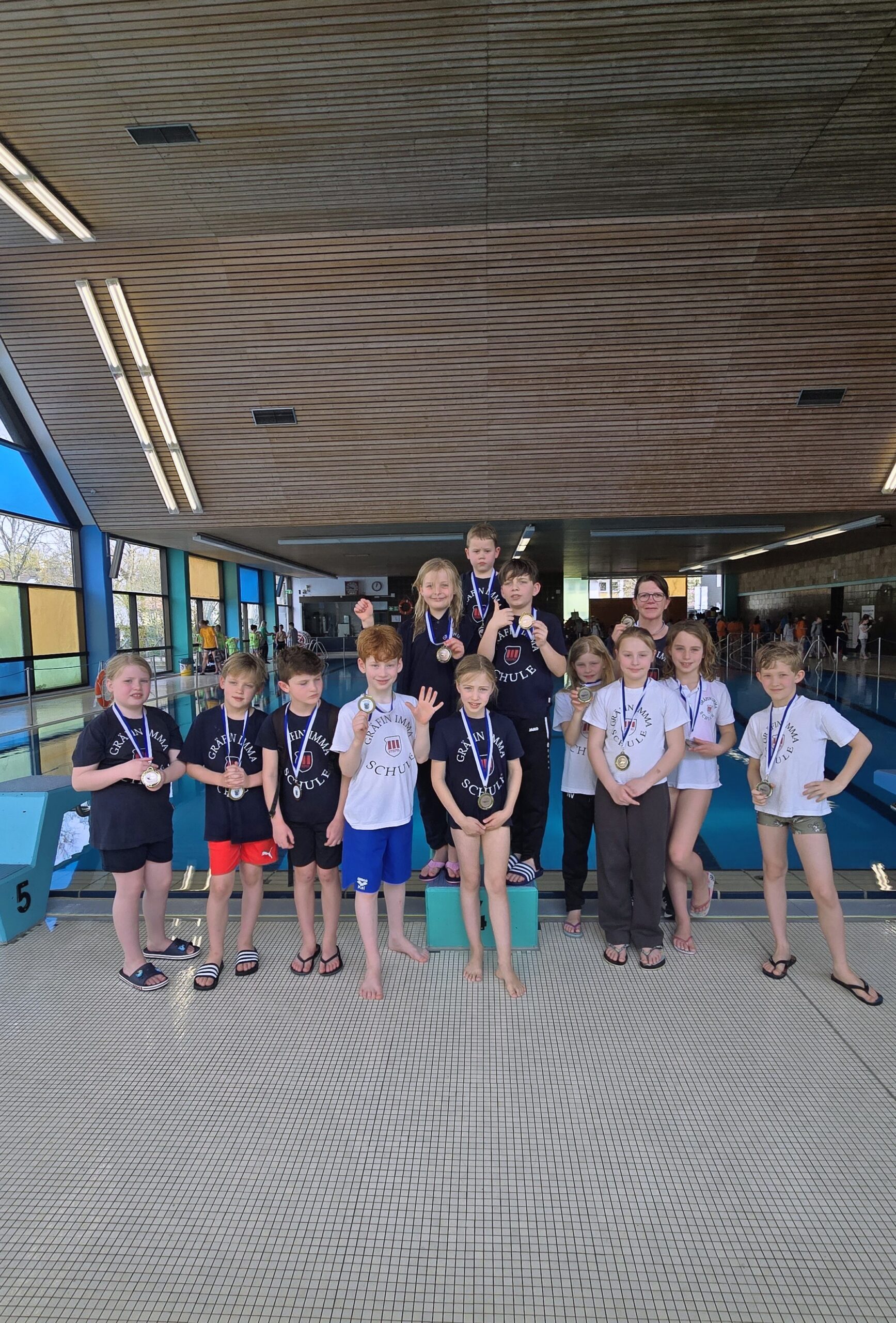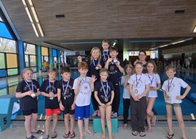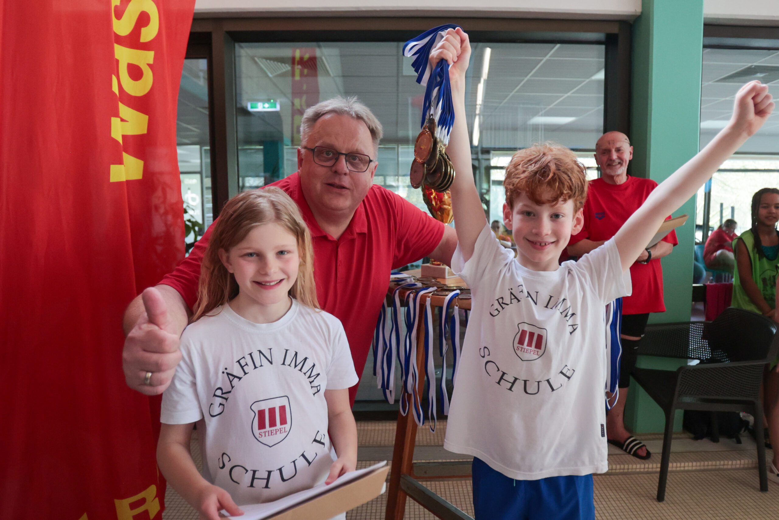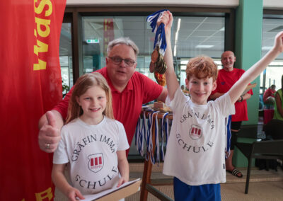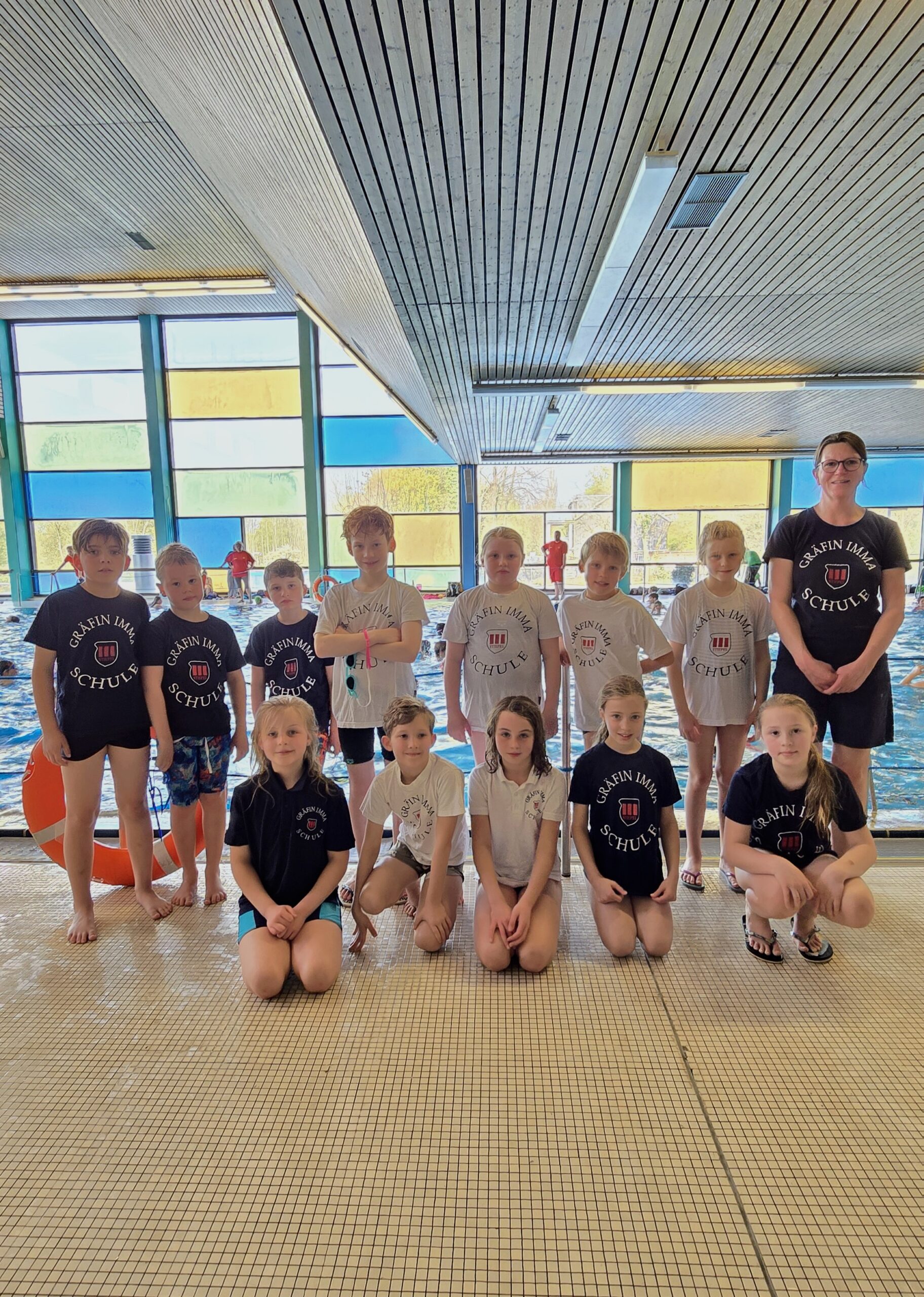 Bei den jeweiligen Staffeln gehen immer 8 der 12 Kinder einer Mannschaft an den Start, alle anderen tragen durchs Anfeuern zur Wettkampfatmosphäre in der Schwimmhalle bei, die in diesem Jahr durch die große Anzahl der teilnehmenden Mannschaften besonders laut war. Alle Gräfin-Imma-Schwimmer wuchsen über sich hinaus und das wurde am Ende durch eine tolle Platzierung belohnt.